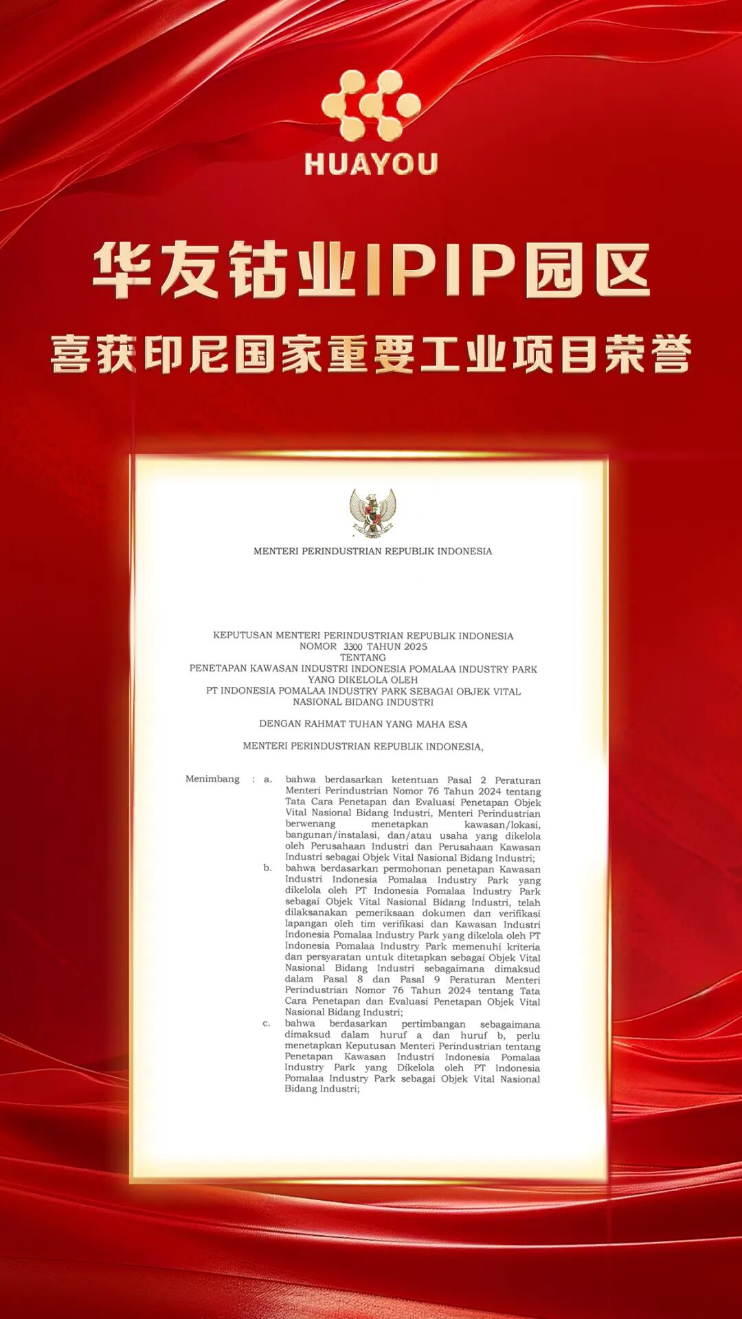9月,華友印尼波馬拉工業園區(IPIP)再獲國家級殊榮——被正式授予“印尼國家重要工業項目(OVNI)”稱號。這是IPIP繼國家戰略項目(PSN)之后的又一印尼國家級榮譽,由國家工業部、司法人權部、警察委員會等多部委聯合評審、多輪實地考察后共同頒發,標志著IPIP的建設與運營能力再獲印尼政府高度肯定。